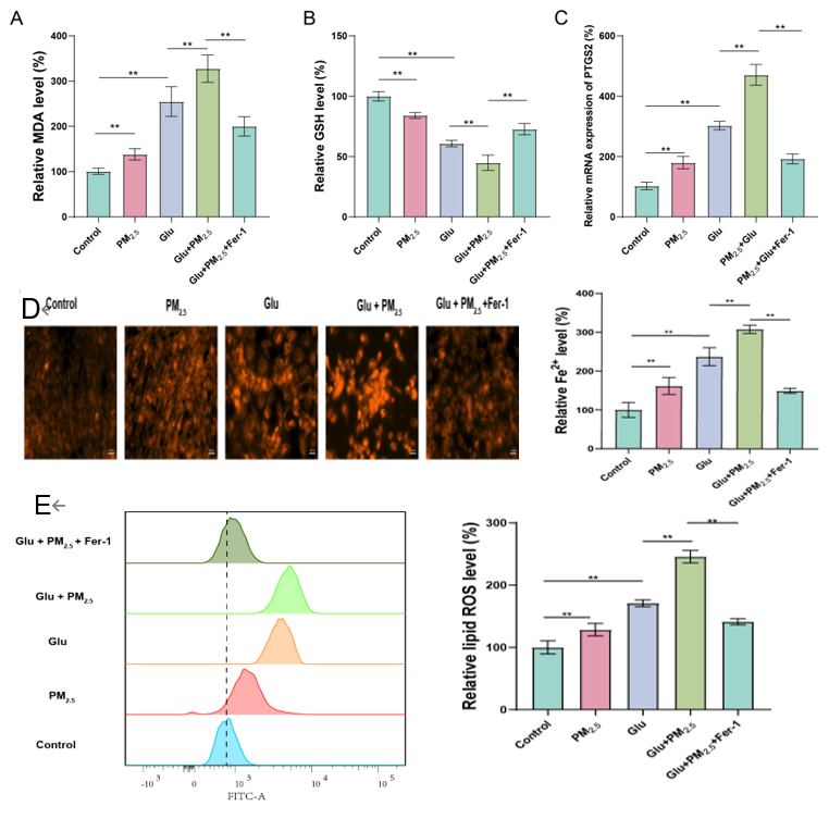 为进一步验证PM2.5暴露是否通过调控铁死亡通路来影响癫痫,我们在细胞实验中对癫痫细胞模型的海马神经元进行了一系列的生化检测。具体实验包括测定MDA(丙二醛)含量(图9A)、GSH(谷胱甘肽)含量(图9B)、PTGS2(前列腺素内过氧化酶2)的mRNA表达(图9C)、细胞内二价铁离子含量(图9D)以及脂质过氧化水平(图9E)。实验结果均表明,PM2.5暴露显著加剧了海马神经元的铁死亡,这与我们的动物实验结果是一致的。