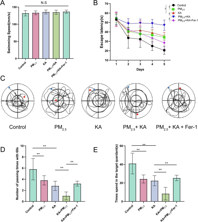 本实验通过Morris水迷宫测试来评估小鼠的学习记忆功能。为了确保实验结果的准确性,实验开始前首先对各组小鼠的运动功能进行了测试,以排除运动功能对实验结果的潜在影响(图5A)。实验结果显示,与其他组相比,PM2.5+KA组小鼠从训练的第三天起逃避潜伏期显著延长(图5B),表明该组小鼠的学习效率较低。在实验的最后阶段,即定位航行测试中,PM2.5+KA组小鼠找到平台的次数及在平台所在象限停留的时间均明显少于其他组(图5C-E)。这些数据表明PM2.5暴露可能会加重癫痫小鼠的认知功能缺陷。而通过铁死亡抑制剂Fer-1的预处理的癫痫小鼠则能缓解PM2.5暴露加重的认知功能缺陷。这一结果提示,铁死亡路径在PM2.5暴露导致的认知功能缺陷中发挥关键作用,且其抑制可有效逆转这些认知缺陷。。