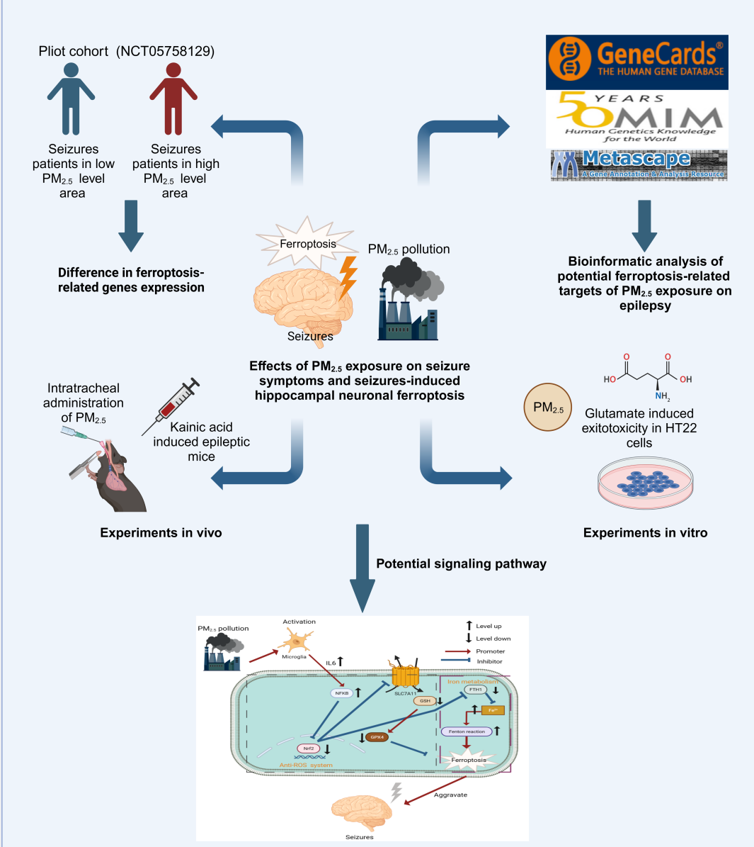 研究人员首先采用GEO数据库中的PM2.5人群队列进行生物信息学分析,该分析提示PM2.5暴露可能影响铁代谢及Nrf2介导的铁死亡途径相关基因的表达。接着,通过小型人群观察队列(NCT05758129)的研究进一步表明,PM2.5暴露同样影响癫痫患儿外周血中铁死亡相关基因的表达水平。此外,通过疾病作用靶点数据库的分析揭示了PM2.5暴露对癫痫潜在作用靶点及机制的影响。进一步的动物及细胞实验确认了PM2.5暴露可加剧癫痫症状及认知功能障碍,铁代谢及Nrf2介导的铁死亡通路在此过程中起着关键作用。这项研究明确了PM2.5暴露对癫痫症状的潜在影响,为预防和控制癫痫的潜在风险因素提供了新的靶点和方向(图1)