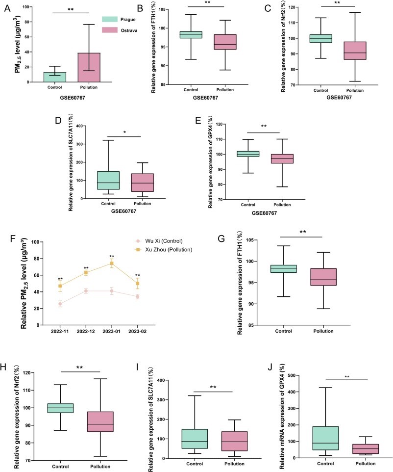 图2(A)捷克两城市的PM2.5水平;(B-E)GSE60767数据集中FTH1、Nrf2、SLC7A11和GPX4基因表达情况;(F)2022年冬季无锡(对照)及徐州(PM2.5暴露)城市PM2.5的相对水平;(G-J)癫痫患者外周血样本中FTH1、Nrf2、SLC7A11、GPX4的基因表达情况