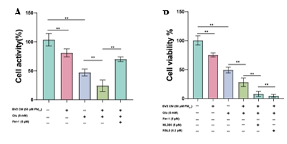 在细胞实验中,我们运用小胶质细胞BV2与海马神经元HT-22细胞,以探究PM2.5暴露是否通过诱导神经炎症来加剧海马神经元的铁死亡。我们采用了CCK-8实验来评估海马神经元的活性。实验结果(图8A-B)显示,PM2.5显著降低了HT-22细胞的活性,从而对海马神经元造成损伤。当加入Nrf2抑制剂(ML385)或GPX4抑制剂(RSL3)时,上述细胞损伤表现得更为严重;反之,当使用铁死亡抑制剂(Fer-1)时,这些损伤得到了明显的缓解。这些发现提示,PM2.5暴露可能通过激活Nrf2和GPX4介导的铁死亡途径,加重海马神经元的损伤。此外,铁死亡抑制剂的应用能有效抑制这种损伤,提示铁死亡途径在PM2.5引起的神经毒性中扮演关键角色。