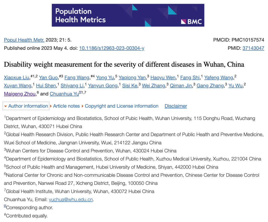 江南大学医学院刘晓雪副教授于2023年5月在《PopulationHealth Metrics》(SSCI/SCI双收录,中科院2区,IF=2.936)发表题为Disability weight measurement for the severity of different diseases in Wuhan, China的文章,研究通过面对面家庭入户调查的方式,并结合互联网调查,共收集5750份内部一致性较好、测量误差较小的受访者数据,计算获得武汉市人群重大慢性病及其他常见疾病不同后遗症的伤残权重(Disability Weight, DW)。
