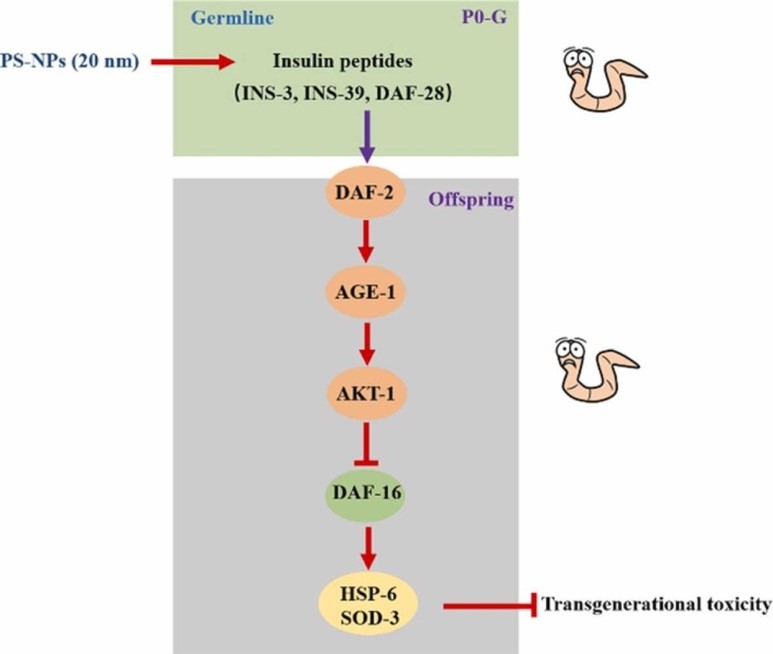 纳米聚苯乙烯暴露引起的毒效应可跨代传递,本研究利用秀丽线虫作为模式动物针对环境剂量纳米聚苯乙烯暴露导致的跨代毒性分子机制展开探究。研究发现三种生殖腺胰岛素配体(INS-39、INS-3和DAF-28)在低剂量下被激活并参与纳米聚苯乙烯跨代毒性的调节。亲本代(P0)生殖腺中的INS-3、INS-39和DAF-28又通过激活子代(F1-F3)肠道中的信号级联DAF-2-AGE-1-AKT-1-DAF-16-HSP-6/SOD-3来参与调控纳米聚苯乙烯的跨代毒效应。