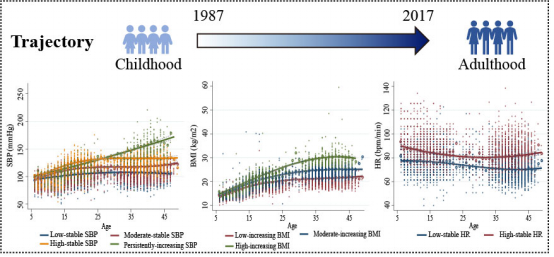 此项研究基于“汉中儿童高血压研究队列”,使用基于组的轨迹建模方法(GBTM)探索了自1987年以后近30年的心血管危险因素轨迹(包括SBP轨迹、BMI轨迹和HR轨迹),代表着中国改革开放30年来人群心血管危险因素的变化,从儿童期开始保持高SBP、BMI和HR轨迹与中年期血管老化的风险增高密切相关。此外,根据CVRF轨迹分组,长期暴露于更多CVRF的受试者,其中年期血管老化的发生风险越高。以上结果提示从儿童时期持续监测CVRF可能是早期识别心血管疾病高危个体的重要方法之一,对于深入认识传统心血管危险因素与血管老化的关系及其探寻早期防控、减少远期心血管风险具有重大意义。
