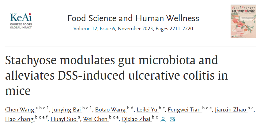 江南大学翟齐啸教授团队在Food Science and Human Wellness(IF=8.022)上发表题目为“Stachyose modulates gut microbiota and alleviates DSS-induced ulcerative colitis in mice”研究论文(水苏糖调节肠道菌群,缓解DSS诱导的小鼠溃疡性结肠炎)。
